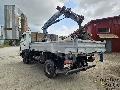 Three-sided tipper truck with crane in working condition.