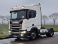 Number of axles: 2, Configuration: 4x2, Own weight: 8072 kg, Gross vehicle weight: 18000 kg, Total fuel capacity: 837 litre, 2nd fueltank, Fifth wheel height: 120 cm, fifth-wheel: Fixed, Diff. locks: 1, Suspension type: air suspension, Cabin type: Sleeping cabin, Cruise control, Tacho, Digital tachograph, Airconditioning, Parking Airco, Parking heater, Electric windows, Electric mirrors, Radio/cassette, Color: white, Heated mirrors, Lighting type: Led lamps, Laneassist, Climatecontrol, Bluetooth, Engine capacity: 302 Kw (405 Hp), Fuel type: Natural gas, Euro: 6, Gearbox kind: Opti-cruise, Gearbox make: Scania, Number of Gears: 12, Add. break system, Retarder make: Scania, Power steering, ABS, ASR, Starter battery, Central locking, Seats configuration: 1+1, Seat cover: cloth, Chair adjustment: Manually